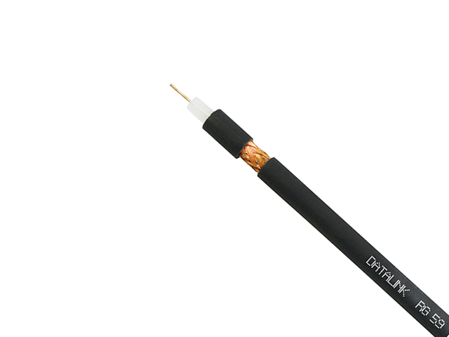 O cabo coaxial RG 59 possui um condutor interno em aço cobreado, isolamento dielétrico de polietileno (PE), uma blindagem em trança em cobre nu com cobertura de 95%, sobreposta por uma capa em PVC.